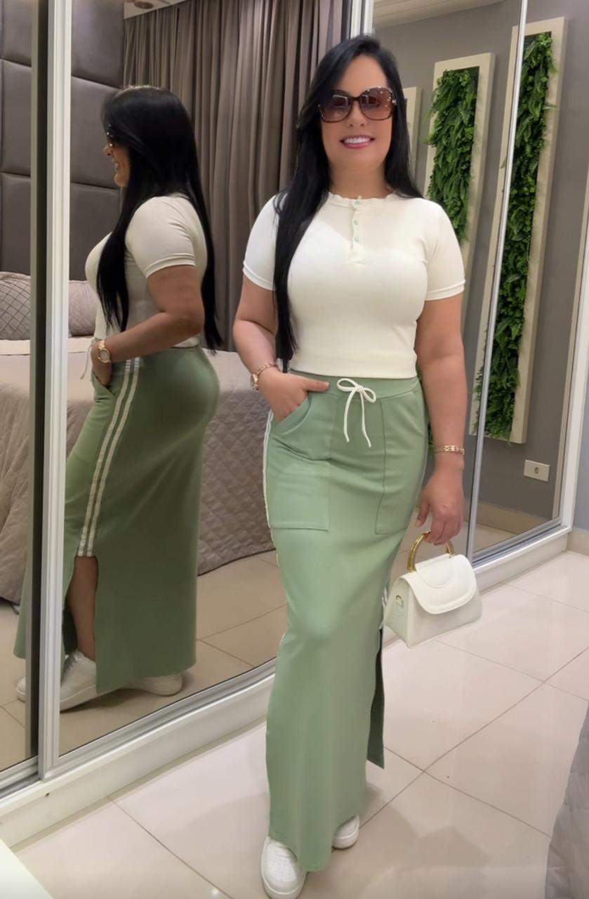 Saia com elástico na cintura, com fenda nas laterais, com bolsos funcionais!